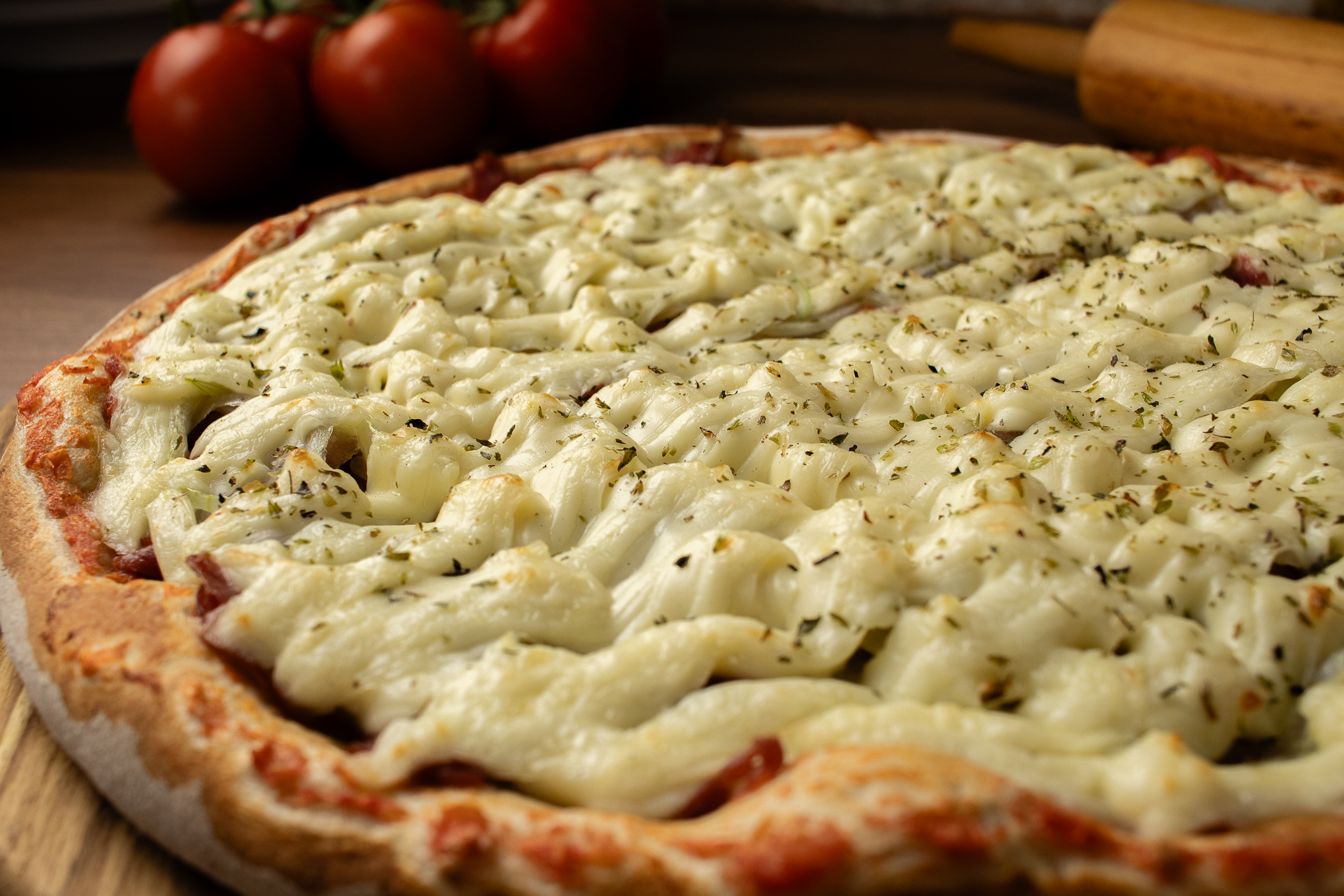 Mozzarella derretida e Catupiry®, combinando perfeitamente com a base de molho de tomates frescos