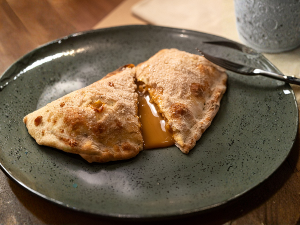 Massa artesanal da Casa assada, recheada com mozzarella derretida. Opcionalmente finalizada com cebola fatiada no recheio