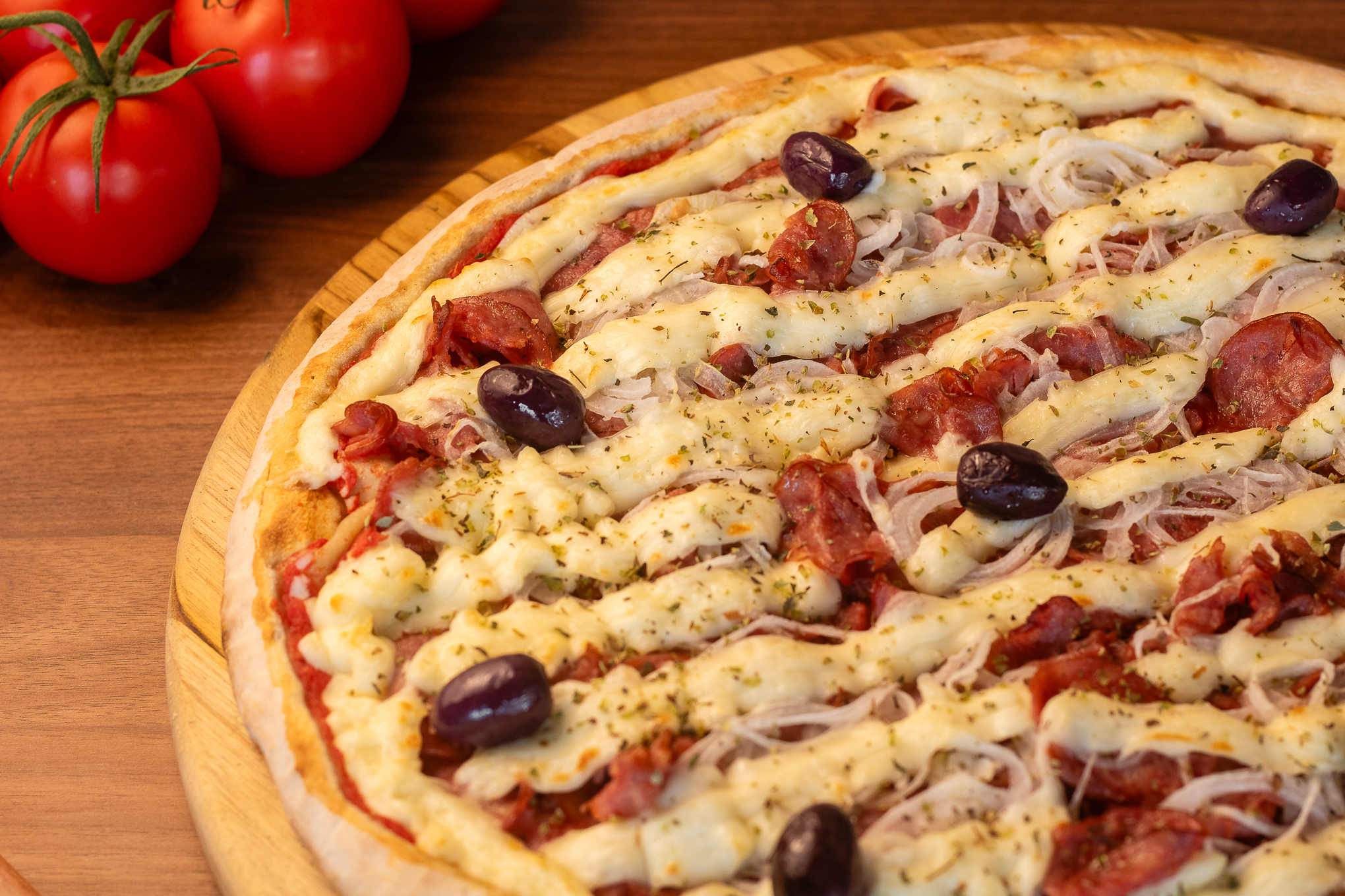 Combinação entre molho de tomates frescos, mozzarella derretida, champignon laminado e fatias crocantes de bacon